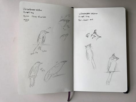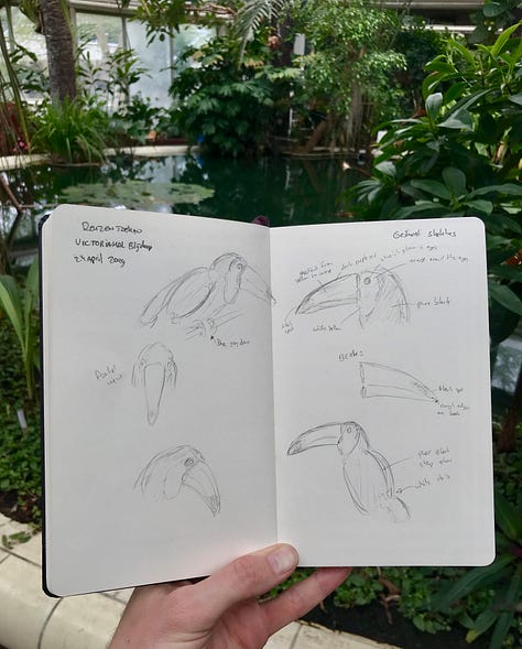 Levende dieren tekenen is makkelijker gezegd, dan gedaan. Bij gesture sketching probeer je de essentie van je onderwerp vast te leggen. Zeker vogels zitten niet stil, waardoor je sneller en simpeler moet tekenen. Je focust op de essentie, beweging, vorm en eigenschappen. Uitdagend voor iemand die normaal in slow-motion miniscule stipjes zet!