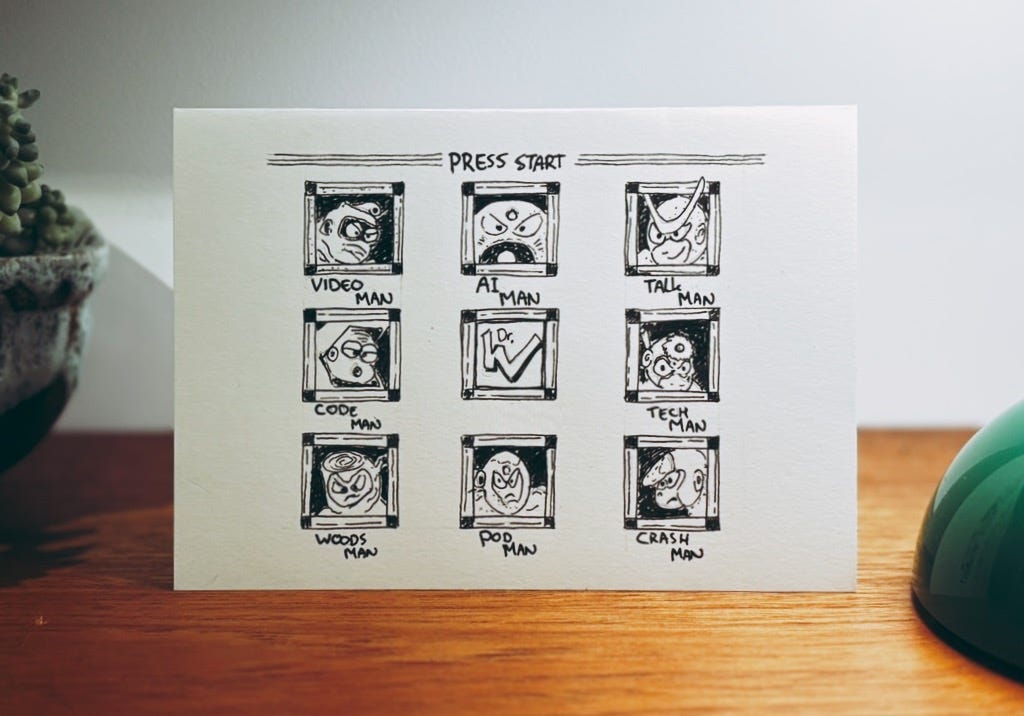 Voor een bevriende Mega Man (fan) die altijd met van alles en nog wat bezig is, tekende ik een kaart met het startscherm van Mega Man II met al zijn karakters.