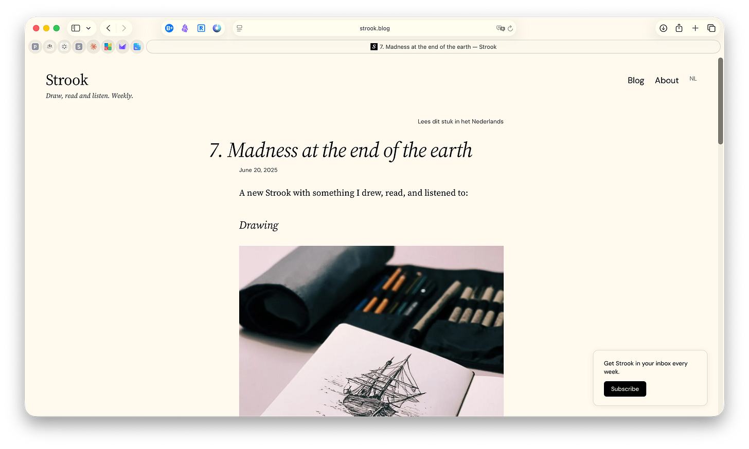 Met Claude Code knutselde ik deze week in extreem korte tijd een persoonlijke blog1 in elkaar: strook.blog. Als ik een Substack nieuwsbrief verstuur, verschijnt deze ook op mijn persoonlijke blog en wordt er automatisch een Engelse vertaling gemaakt die ik weer kan delen. Ik schreef geen letter code. Het was wel weer verslavend leuk.